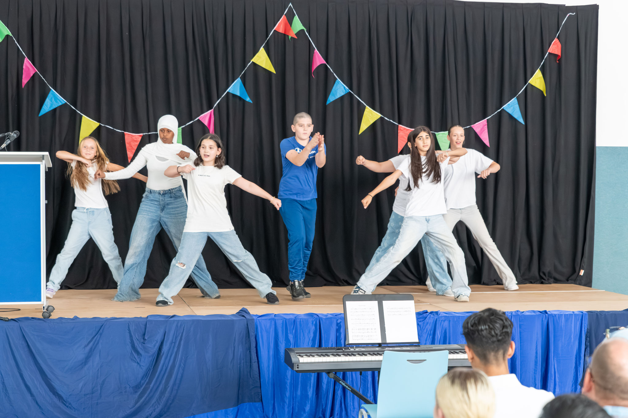Anschließend begrüßten Schülerinnen und Schüler die "Neuen" in verschiedenen Sprachen, bevor Petar Delic, 8a als Schülervertreter in seiner Rede allen gute Wünsche und Mut mitgab. Mit starken Hip-Hop-Tanzeinlagen stellte sich die Tanz-AG unter der Leitung von Rousel Mohamad vor, die in Kooperation mit der Tanzschule Mundt besucht werden kann. Die Stufenleiterin Frau Rollwage richtete ihr Wort an die Anwesenden und stellte wichtige Personen der Schule vor, wie die Schulkrankenschwester Frau Lehr, die sozialpädagogischen Fachkräfte Frau Jarid und Frau Voß.