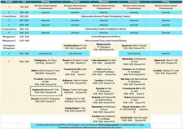 Liebe Eltern, bitte beachten Sie bei der Anmeldung für die offenen Angebote, dass Ihr Kind zum Zeitpunkt des Kurses nicht schon eine stundenplanmäßige Verpflichtung hat.